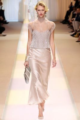Giorgio Armani brought to us "expect the unexpected" Couture show that is everything but not what we had a chance to see from him in the couple of his previous couture shows. Known for his clean, tailored lines for a professional woman in Paris Couture show for Fall 2013 he delivered the absolutely opposite. He illuminated that Paris night with romance, sensitivity, softly and lovingly lines. He opened couture show with impeccable tailored suits for a classy couture Armani woman. Followed with a perfect cocktail dresses and evening wear in essay of nude palette.